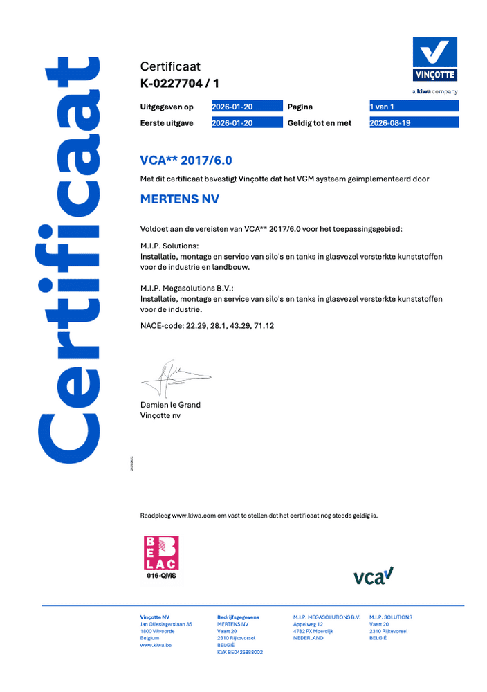 Aan kwaliteit en certificering wordt voortdurend gewerkt bij M.I.P.. Daarom worden al onze tanks en silo’s geproduceerd volgens de hoogste industriestandaarden en conform de hedendaagse, strenge, Europese normen.